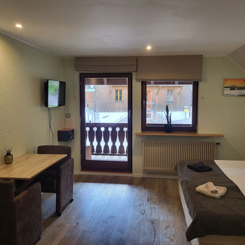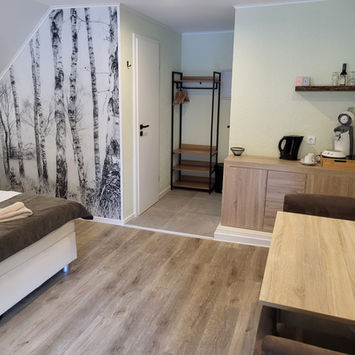Stijlvolle tweepersoonskamer met boxspring (1,80m), eigen badkamer, terras en koelkast. Inclusief koffie, thee en fruit. Kan samen met Nebel Waldzimmer als familiekamer worden geboekt. Ideaal voor een ontspannen verblijf.
